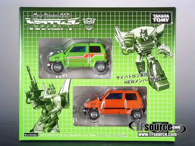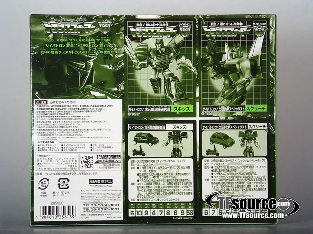 This exclusive set of Skids & Screech is a mail in exclusive, only available via purchase of the Transformers Generations 3 book and is very limited in its release. It features two repainted figures, 1st is Dimensional Theory Researcher Skids (Green version) and second is Dimensional Attack Specialist Screech (Red version). This set is supposedly limited to just 2000 sets worldwide and TFsource has a very limited amount to go around.