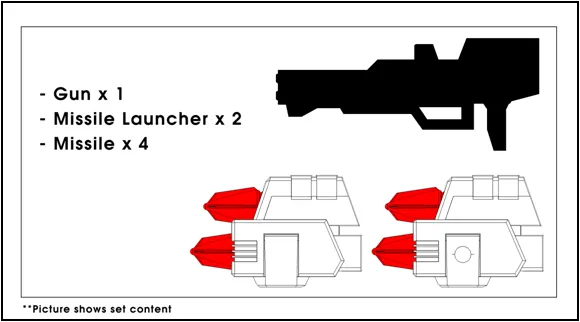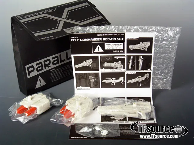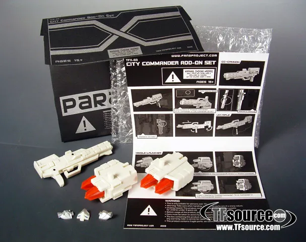 TFX-03 City Commander Gun and Missiles is a upgrade kit, meant to complement your City Commander Trailer Kit, a custom add-on kit by Fansproject. Set includes: a gun that can be transformed into two modes, and two missile launchers that can be added on both modes and stored inside the trailer.