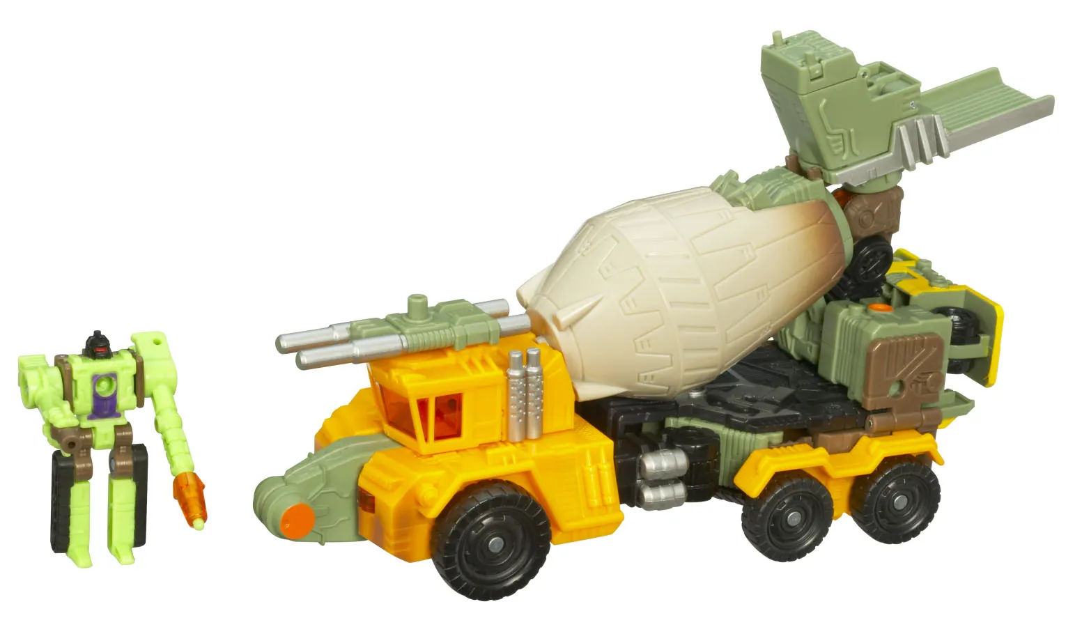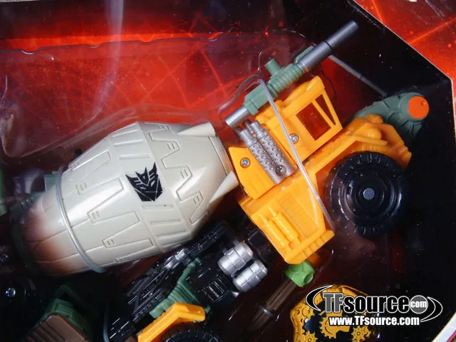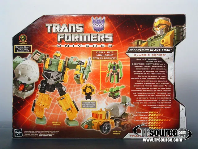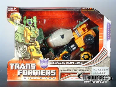 Transformers Universe Decepticon Heavy Load with Drill Bit Mini-Con transforms from a Mixer Truck to robot and back, is a Voyager Class-scaled figure and stands approximately 7-inches tall in robot mode.