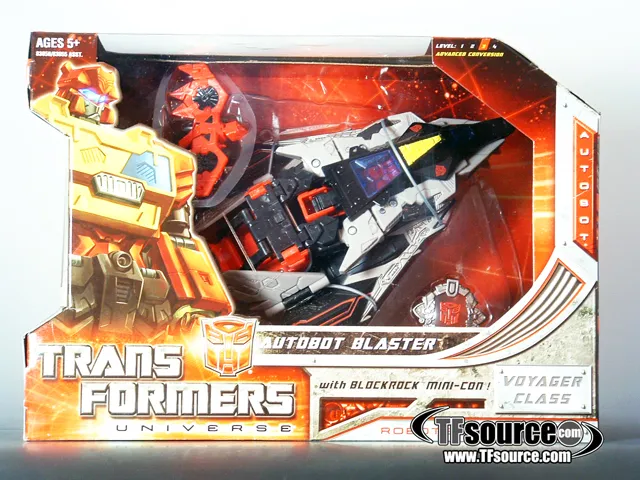 Transformers Universe Autobot Blaster with Blockrock Mini-Con transforms from a Space Ship to robot and back, is a Voyager Class-scaled figure and stands approximately 7-inches tall in robot mode.
