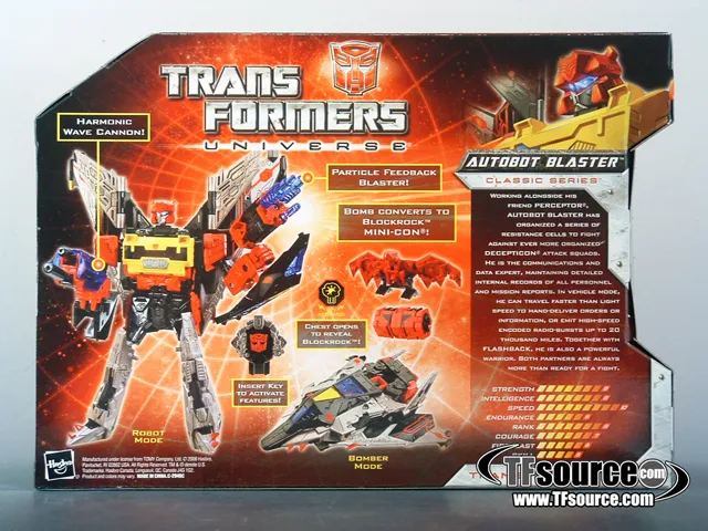 Add this Autobot Blaster with Blockrock Mini-Con to your Transformers Universe Collection today. Add this highly sought-after piece to your collection at TFSource, your source for Hasbro Transformers Collectible Action Figures.