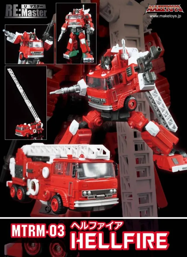 Make Toy's figures take your collection to the next level with RM-03 Hellfire, a Masterpiece Scale-scaled 3rd party figure that transforms from Fire Truck to robot and back.