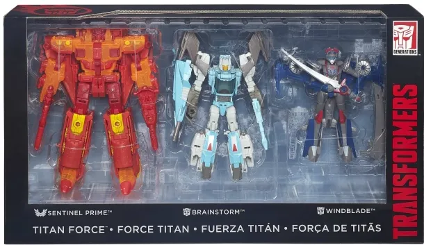 Transformers Titans Return Titan Force Set SDCC Exclusive is a limited edition San Diego Comicon Exclusive Boxed Set. It includes Voyager Class Sentinel Prime, Deluxe Class Brainstorm and Windblade as well as 2 Titan Master fiures: Autobot Teslor and Autobot Infinitus all in one great boxed set.