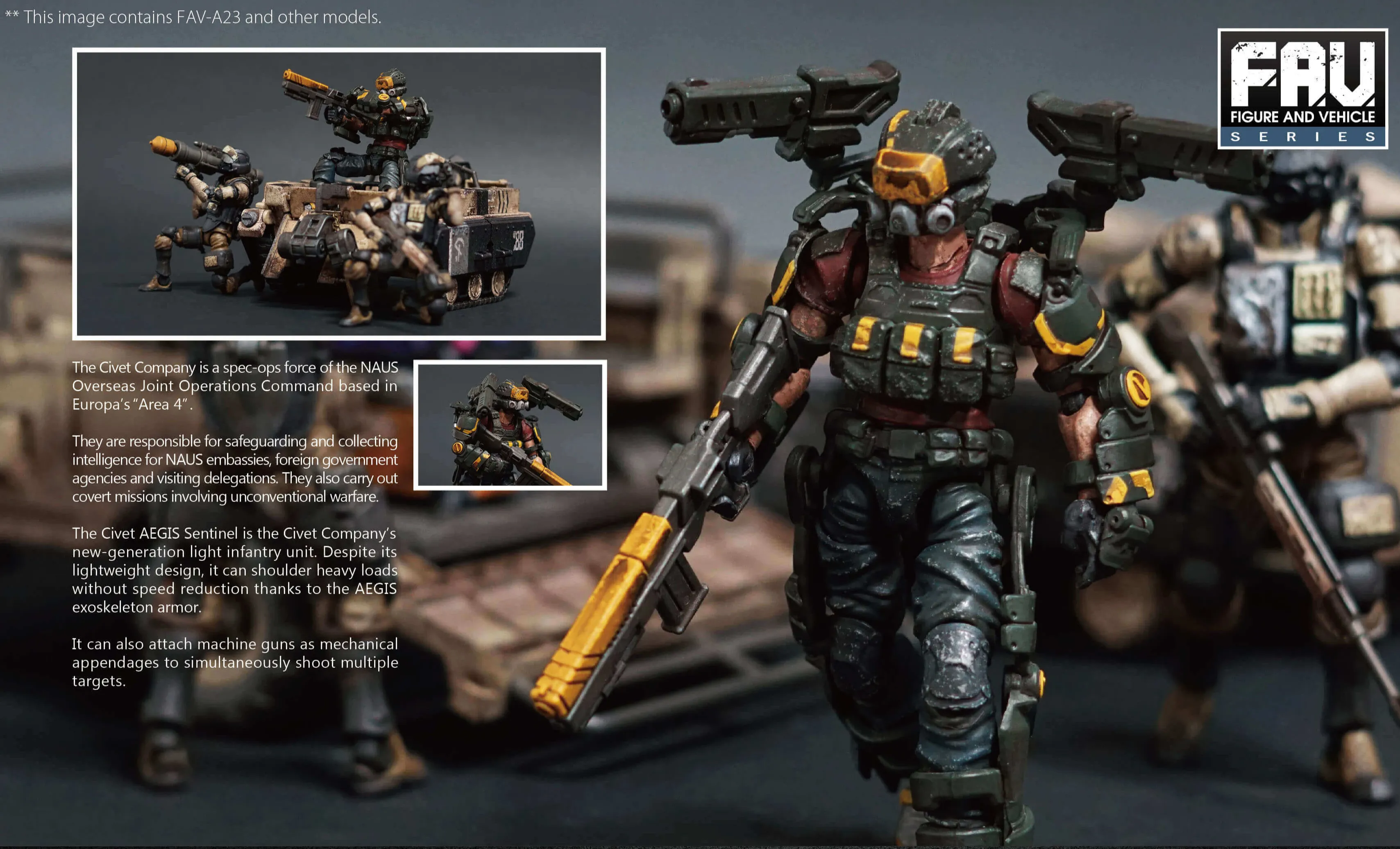 The Civet Company is a spec-ops force of the NAUS Overseas Joint Operations Command based in Europa’s “Area 4”. They are responsible for safeguarding and collecting intelligence for NAUS embassies, foreign government agencies and visiting delegations. They also carry out covert missions involving unconventional warfare.