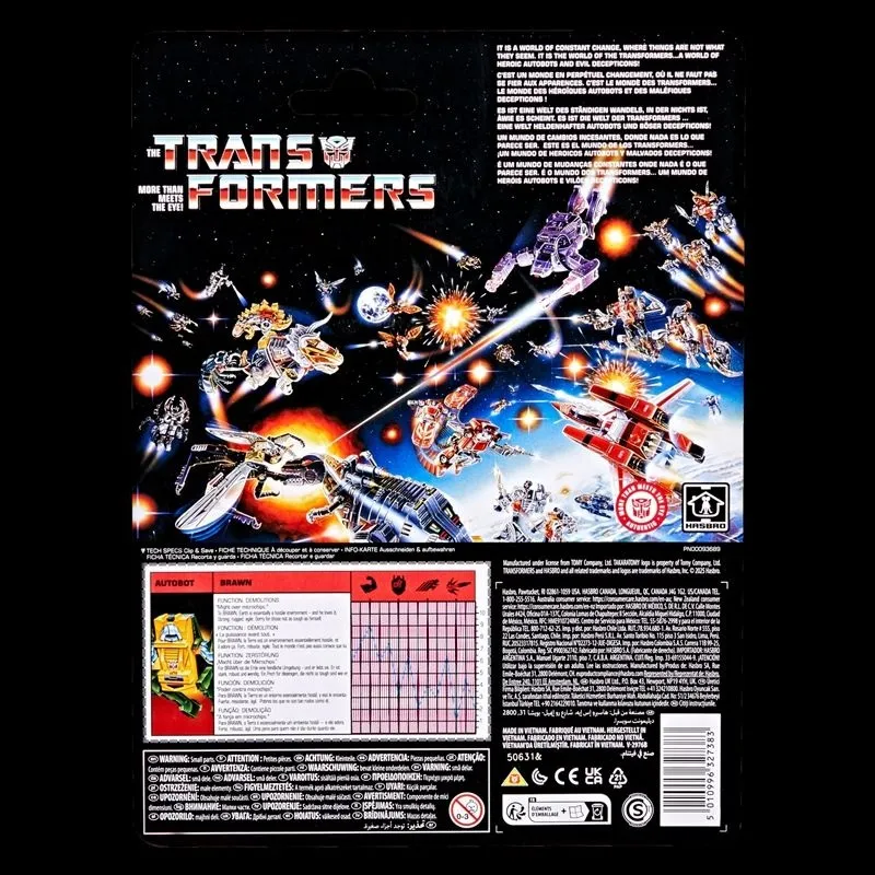 To Brawn, Earth is essentially a hostile environment, and he loves it. He’s strong, rugged, and agile. He delights in challenges and is sorry for those not as tough as himself. Transformers Retro G1 action figures feature vintage styling, accessories, and special package art and tech specs.