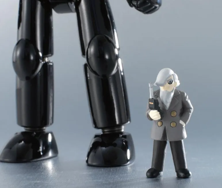 Recreate the dynamic scene where Black Ox fights alongside Tetsujin 28 with the damaged head parts.