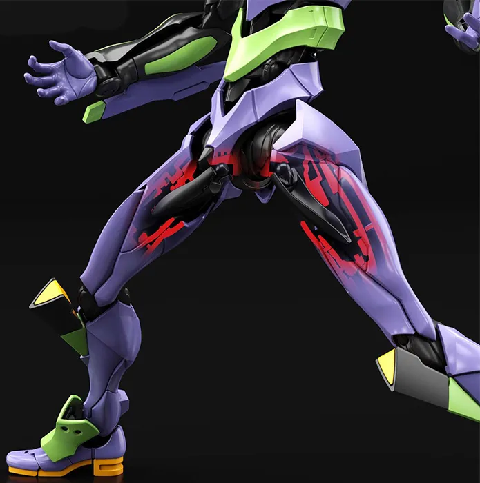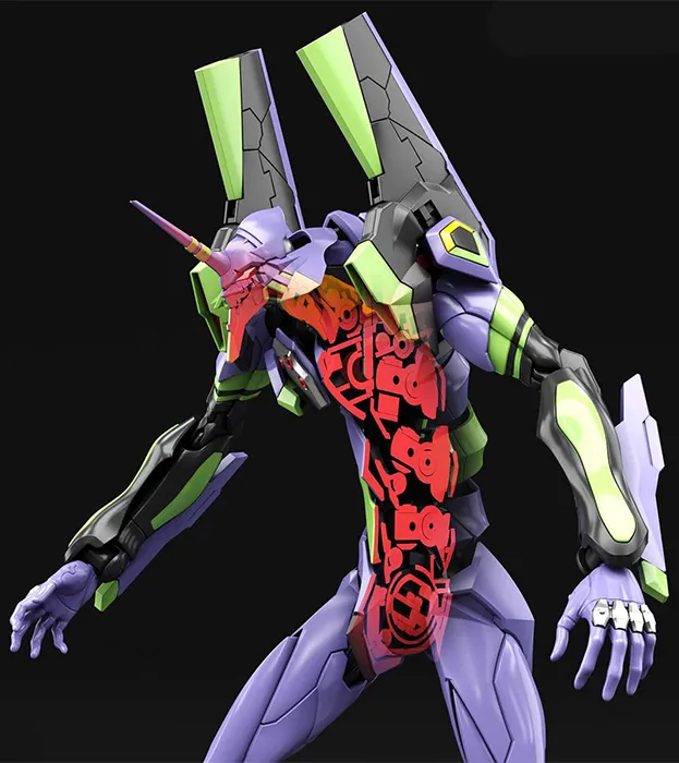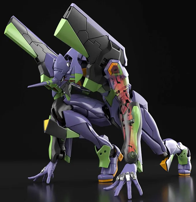 The movement of the spine and shoulder blades are linked to the armor parts and follow the movement of the arms and chest, shifting as needed to prevent parts from obstructing each other. From this, realistic humanoid crouching and running poses can be re-created for EVA Unit-01.