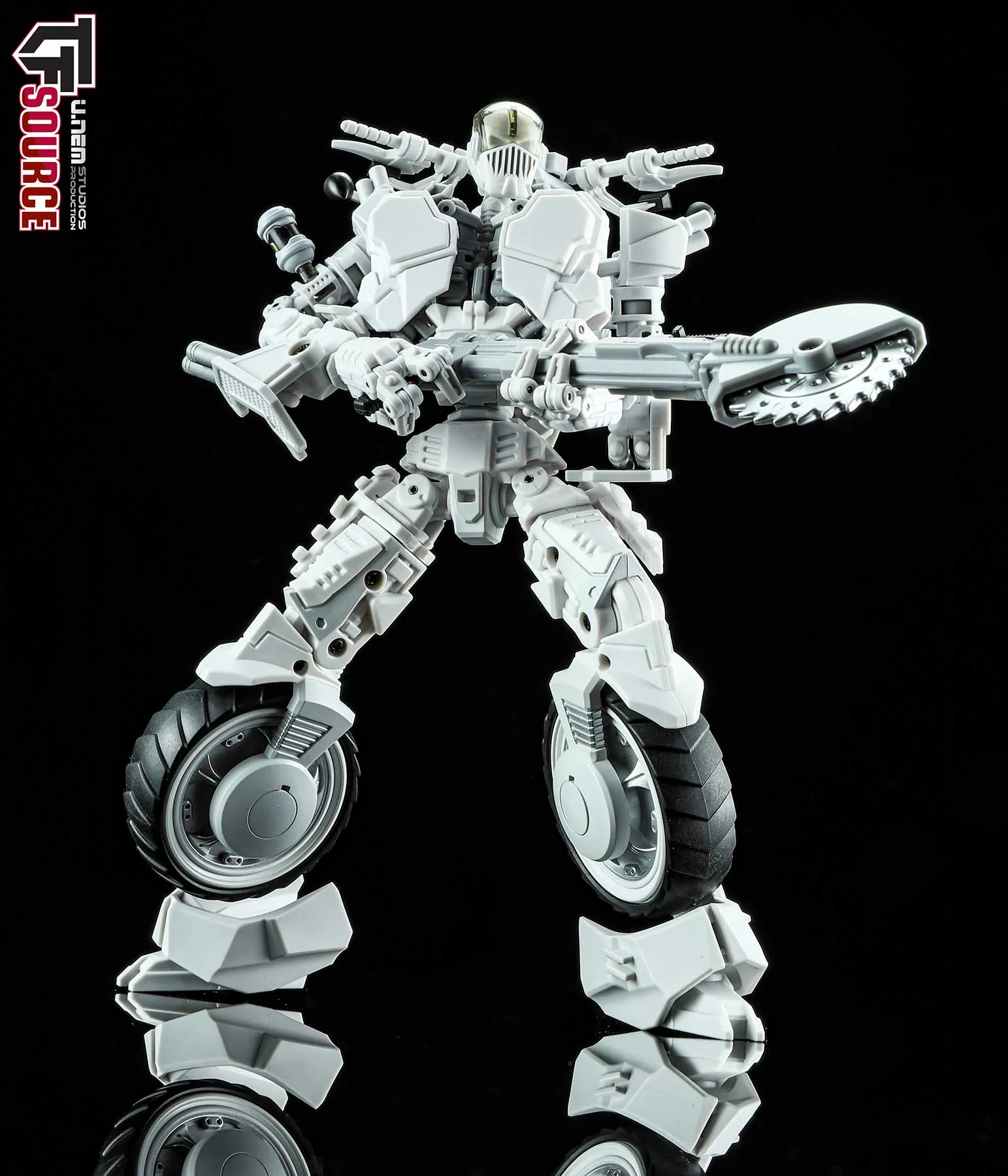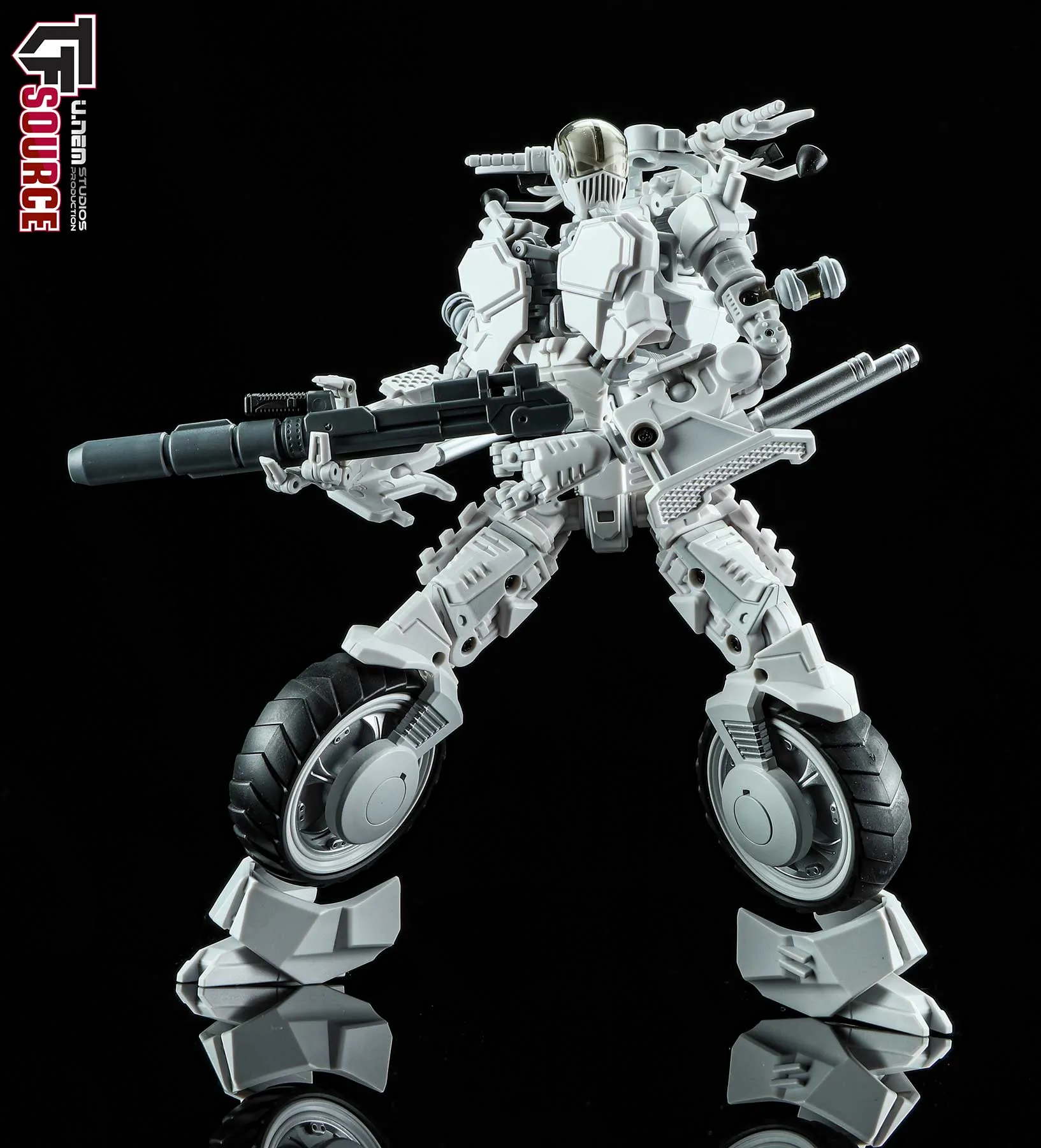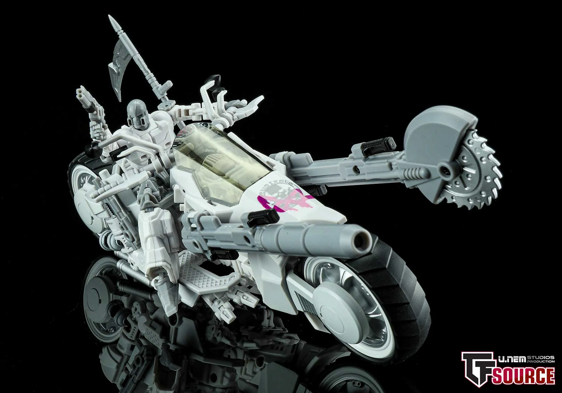 The Unrustables Cybertech Series MM02 Specter Rogues rifle and buzzsaw attachment can attach to his bike