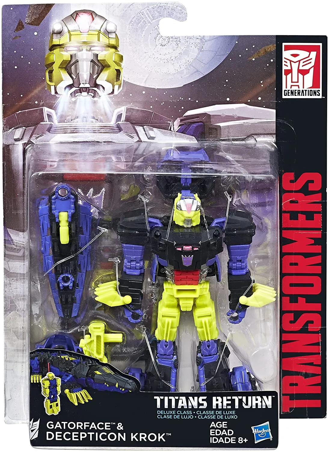 Transformers Generations Titans Return Deluxe Class figures are 5.5-inch scale figures that come with a Titan Master figure. The Titan Master figure becomes the head of the Deluxe Class figure. It also works with Deluxe Class, Voyager Class, and Leader Class Titans Return figures (each sold separately). In Titans Return, the Autobots and Decepticons unite with Titan Masters, small bots that carry a power boost. Titan Masters are key to controlling an ancient race of warriors the size of cities: the Titans. Character Specs: Decepticon Krok: foot soldier Gatorface: systems lock Unite and power up for battle. Figure Specs: Deluxe Class Decepticon Krok Modes: robot, crocodile Converts in 12 Steps Works with other Titan Master figures (each sold separately) 2 accessories Comes with a collector card with tech specs Titan Master Gatorface Modes: robot, head Converts in 1 step