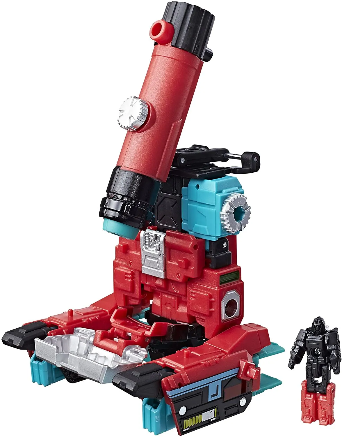 Transformers Generations Titans Return Deluxe Class figures are 5.5-inch scale figures that come with a Titan Master figure. The Titan Master figure becomes the head of the Deluxe Class figure. It also works with Deluxe Class, Voyager Class, and Leader Class Titans Return figures (each sold separately). In Titans Return, the Autobots and Decepticons unite with Titan Masters, small bots that carry a power boost. Titan Masters are key to controlling an ancient race of warriors the size of cities: the Titans. Character Specs: Autobot Perceptor: scientist Titan Master Convex: ability to shrink to microscopic size Unite and power up for battle. Figure Specs: Deluxe Class Autobot Perceptor Modes: robot, microscope Converts in 13 Steps Works with other Titan Master figures (each sold separately) 2 accessories Comes with a character card with tech specs Titan Master Convex Modes: robot, head Converts in 1 step.