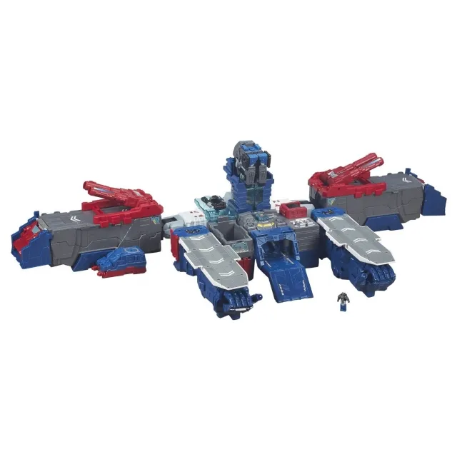 When they're all connected, the Fortress Maximus Hasbro figure stands nearly 2 feet tall! It features lights and battle sounds, a character card with tech specs, a Cerebros figure, and a Titan Master Emissary figure. Cerebros converts from robot to the head of Fortress Maximus in 5 steps, while Titan Master Emissary converts from robot to head for any Deluxe, Voyager, or Leader Class Titans Return figures in 1 step.