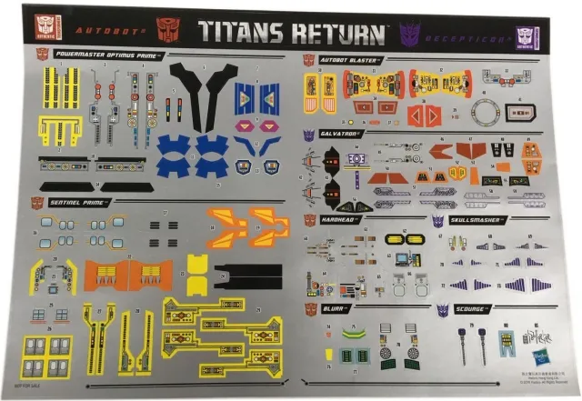 This sticker set is exclusive to certain regions of Asia and is an official Hasbro/Transformers product. Includes stickers for Titans Return Leader Class Powermaster Optimus Prime, Blaster, Galvatron, Sentinel Prime, Hardhead, Skullsmasher, Blurr & Scourge!