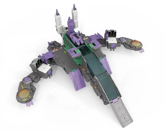 Trypticon is built for conquest. With a spaceship mode that allows him to travel between planets and a battle station mode that establishes a stronghold when he arrives, the Decepticon Titan is capable of single-handedly wiping out any target in any location in the galaxy. His appetite for destruction is rivaled only by his appetite for Titan Masters, which he consumes like other bots devour refined Energon cubes. His own Titan Master servant, Decepticon Necro, hungers for something far more sinister. Decepticon Necro harvests the sparks of other bots, consuming the very thing that gives them life. Wherever these Decepticons travel, they bring doom and ultimate destruction.