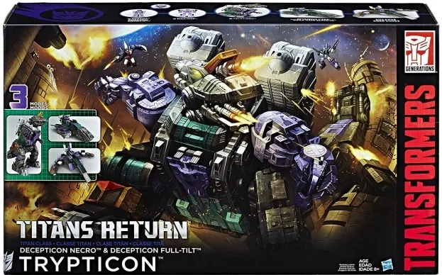 This Transformers Generations Titans Return Titan Class Trypticon figure is the largest Titan Class Decepticon figure produced to date. Voted into the line by fans, the Triple Changer figure converts from T-Rex to spaceship to city. It comes with a Decepticon Full-Tilt figure that converts from robot to tank and a Titan Master Decepticon Necro figure that converts from robot to head.