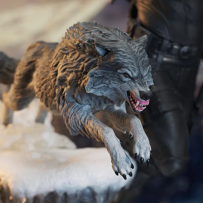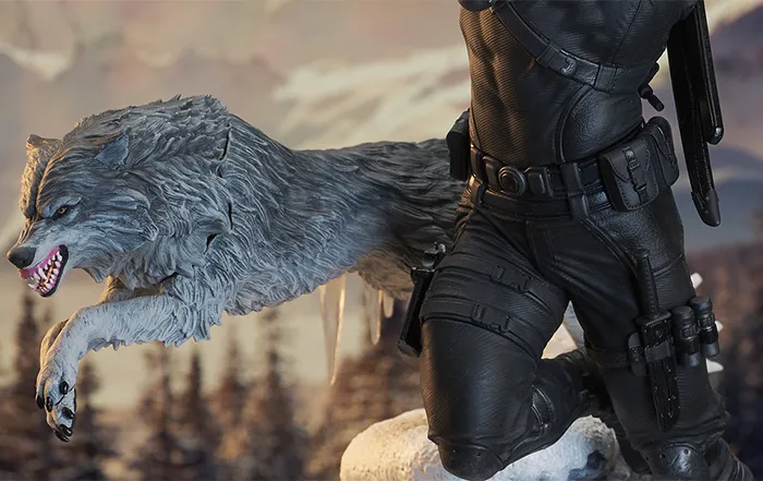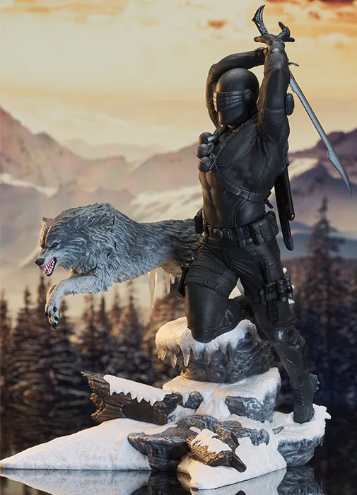G.I. Joe's silent ninja, Snake Eyes, leaps from a snowy ledge in this all-new PVC diorama from DST! Flanked by his wolf companion Timber, Snake Eyes wields his trademark sword as he launches his sneak attack. Measuring approximately 11" tall, this diorama features detailed sculpting and paint applications, and comes packaged in a full-color window box.