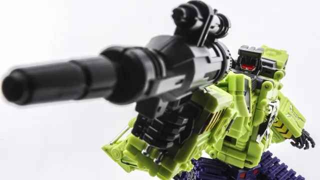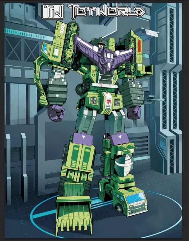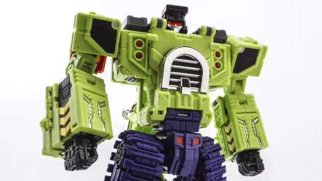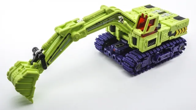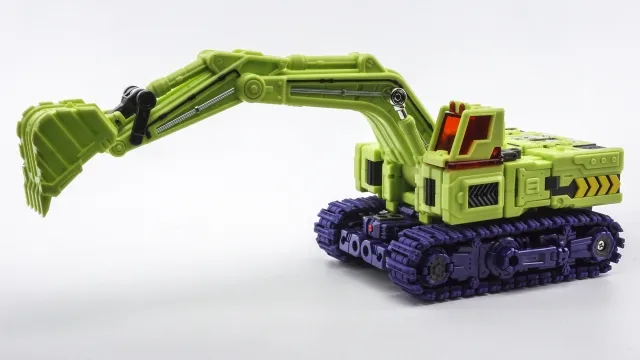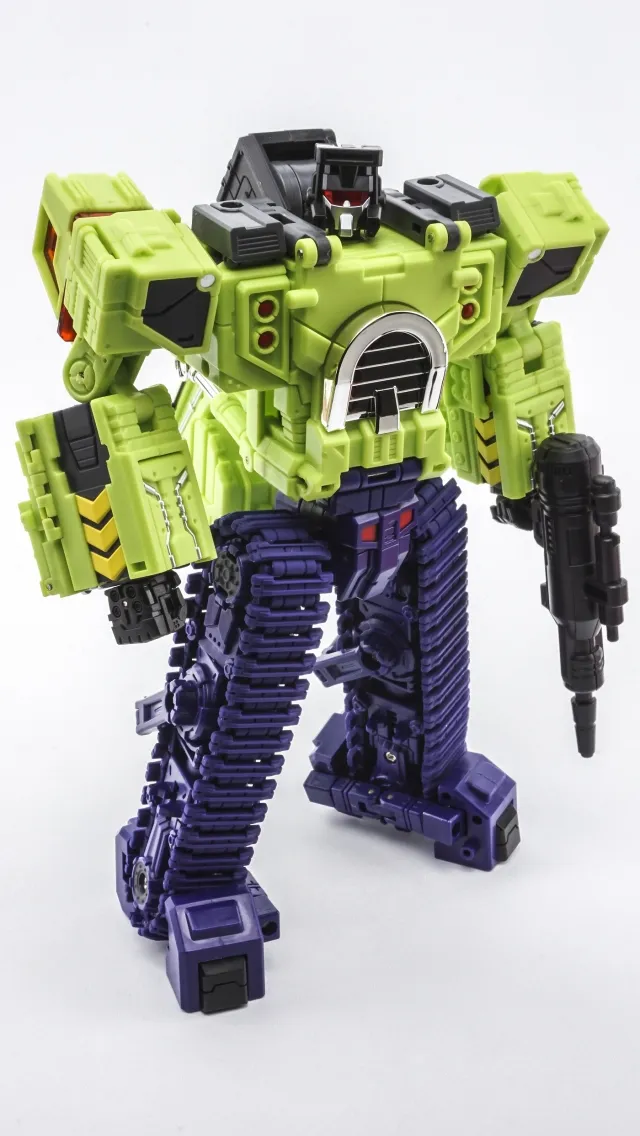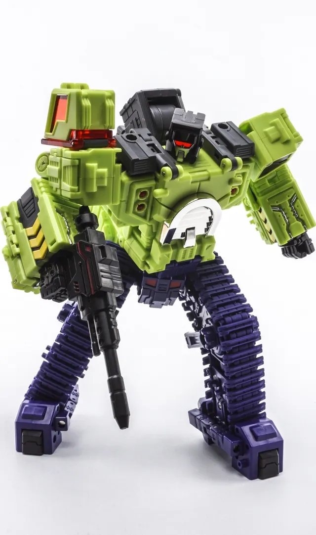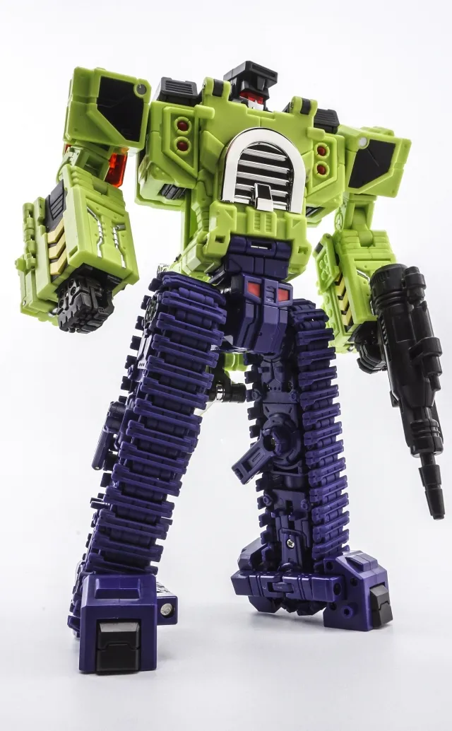 This mighty construction combiner will stand around 20"/50CM tall when combined! Robots feature moving tank tracks, LED lights, and weapons that fire.
