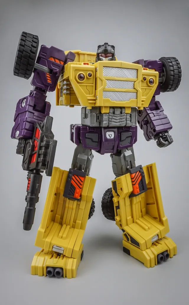 This mighty construction combiner will stand around 20"/50CM tall when combined! Robots feature moving tank tracks, LED lights, and weapons that fire.