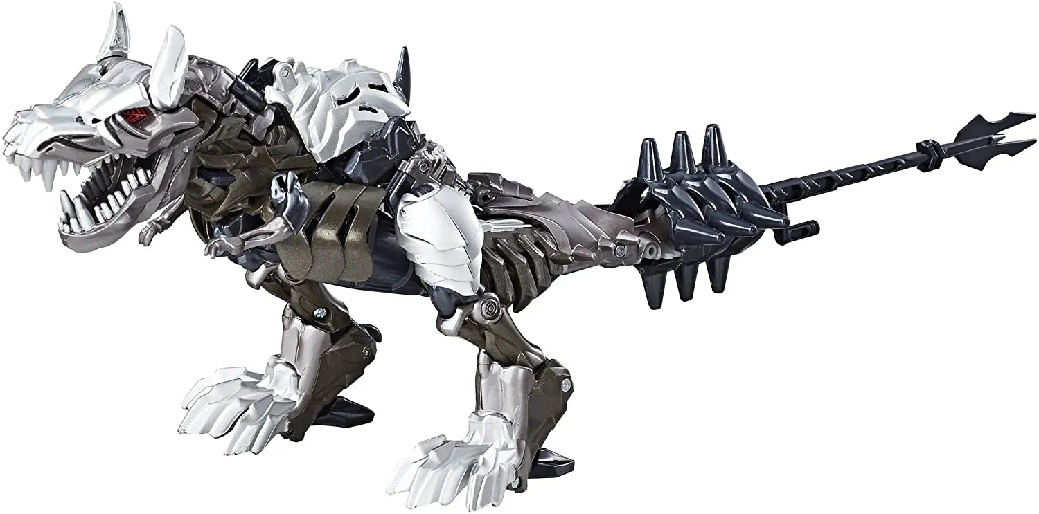 The explosive Transformers saga continues with Transformers: The Last Knight. With the fate of Earth at stake, new heroes must rise in an epic struggle to forge a future for all. The legendary action comes to life with Transformers: The Last Knight Premier Edition Voyager Class figures. This Premier Voyager Grimlock figure converts from robot to T-rex in 18 steps and comes with battle mace accessory. The Premier Edition features iconic characters with movie-inspired details from Transformers: The Last Knight. Superior skill combined with prehistoric power make Grimlock one of the most dominant warriors alive. This legendary Dinobot commands respect by valiantly defending Earth alongside Optimus Prime. The steel-crushing jaws of Grimlock could be just what the Autobots need to rip through a cataclysmic foe that threatens to destroy life as we know it.