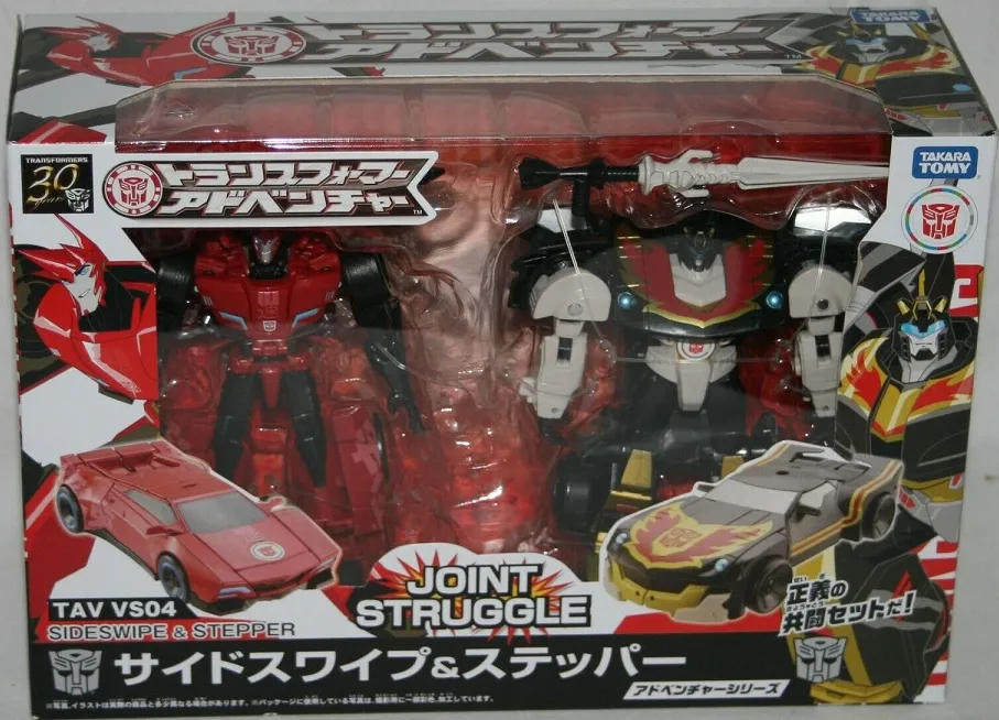 TAVVS04 Sideswipe and Stepper is a Japanese Exclusive figure released by Takara Tomy in Japan. TAVVS04 Sideswipe and Stepper is a Japanese recolored version of the US Transformers Robot in Disguise figure.