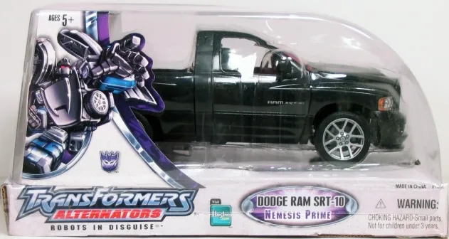 Transformers Alternators Nemesis Prime is a 1:24th scale figure that is officially licensed by Dodge and manufactured by Hasbro. This figure is a recolor of Optimus Prime as Nemesis Prime and was a figure exclusive to SDCC San diego Comicon.
