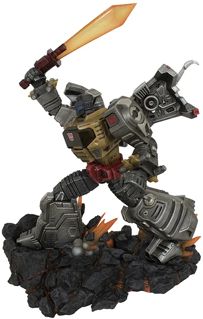 A Diamond Select Toys release! The leader of the Dinobots has risen! Stomping through a flaming, lava-filled landscape, the monosyllabic Dinobot known as Grimlock wields his sword in the hunt for more Decepticons to pulverize. This approximately 12 inch PVC sculpture features detailed sculpting and paint applications and comes packaged in a full-color window box. Designed by Mark Wong; sculpted by Victor Hugo Sousa.