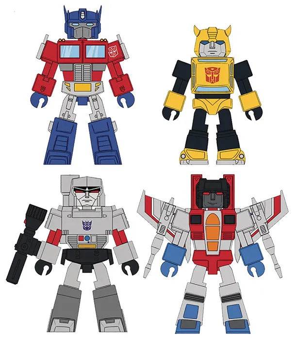 Roll out! The Transformers return for this exclusive four-pack featuring the Autobots and Decepticons in their cartoon colors! Optimus Prime, Bumblebee, Starscream and Megatron look like they just leaped off the TV screen... and into special edition VHS case packaging! These 2-inch Minimates feature multiple points of articulation and fully interchangeable parts and accessories, and they slide out of an illustrated VHS sleeve! Designed and illustrated by Barry Bradfield! Limited to 2,500 pieces