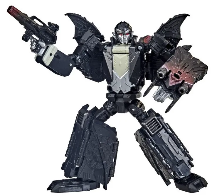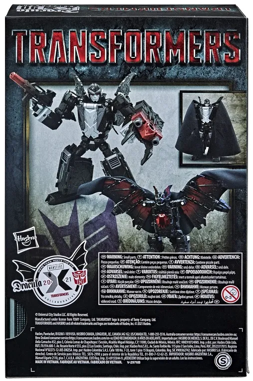 The Draculus figure is inspired by the vampire from the 1931 Universal Pictures film, Dracula. Figure converts into bat mode in 23 steps. Figure features details inspired by the Dracula movie, including black and white deco inspired by the black and white movie release. Comes with cape, blaster, and Impaler claw accessories.