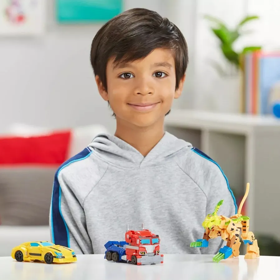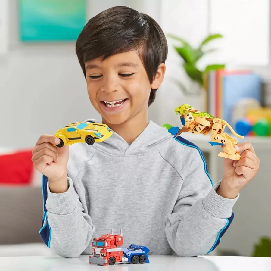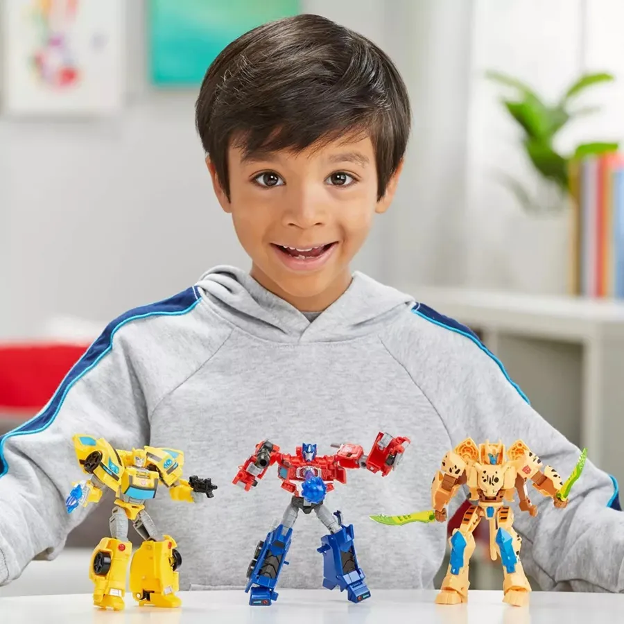 Imagine saving the planet Cybertron with the Heroes of Cybertron 3-pack! Convert Optimus Prime toy from truck to robot mode in 13 steps, Bumblebee toy from sports car to robot mode in 18 steps, and Cheetor toy from cheetah to robot mode in 11 steps. Includes Stinger, 2 blasters, Energon saber-toothed tiger helmet, shield, tiger claw, 2 scimitars, and 2 blast effect accessories.
