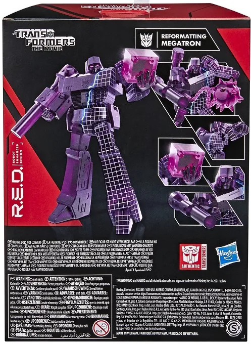 Highly poseable with 64 deco ops, this Megatron R.E.D. figure was designed to bring collectors the most screen-accurate version of the character to display on their shelf. The tyrannical Decepticon leader from the 1986 animated movie features 23 points of articulation and deco inspired by the iconic scene where Unicron reformats Megatron into one of his Heralds. The figure depicts Megatron midway through his rebirth into the immensely powerful and menacing Galvatron. Includes iconic Fusion Cannon, 4 alternate hands including one that holds an Energon cube, and an Energon mace accessory.