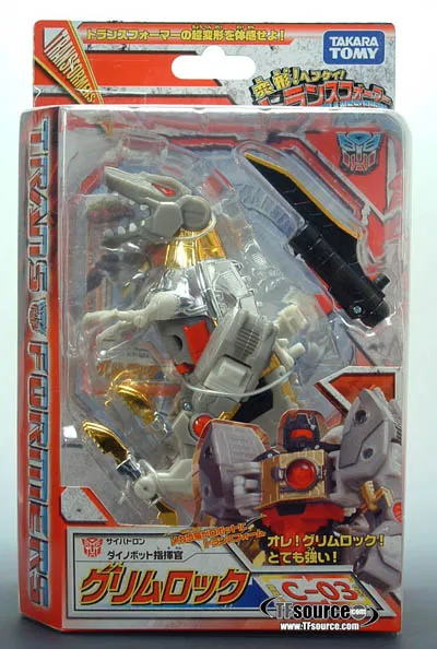 C-03 Grimlock is part of Takara Tomy's Henkei Classics line which was available exclusively in Japan. C-03 Grimlock is Deluxe Class-scaled, stands approximately 6-inches tall in robot mode and transforms from a Tyrannosaurus Rex to robot and back.