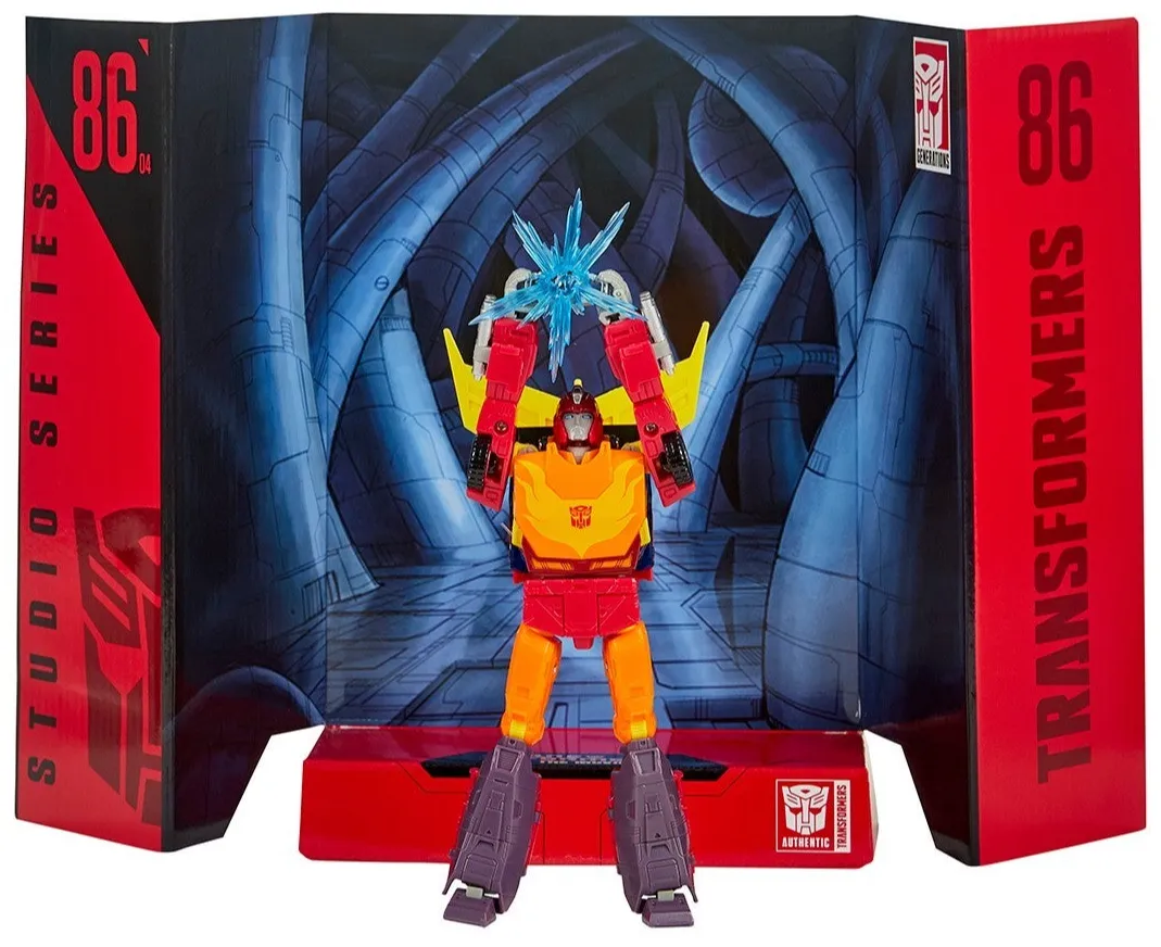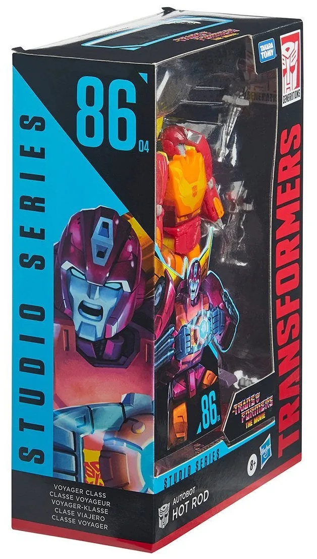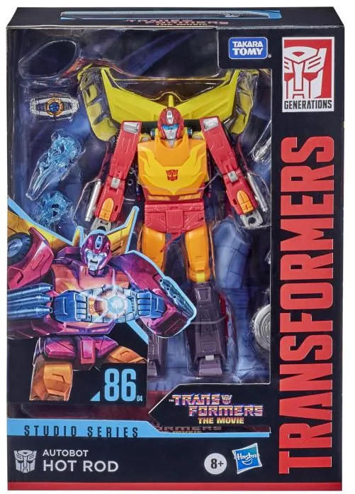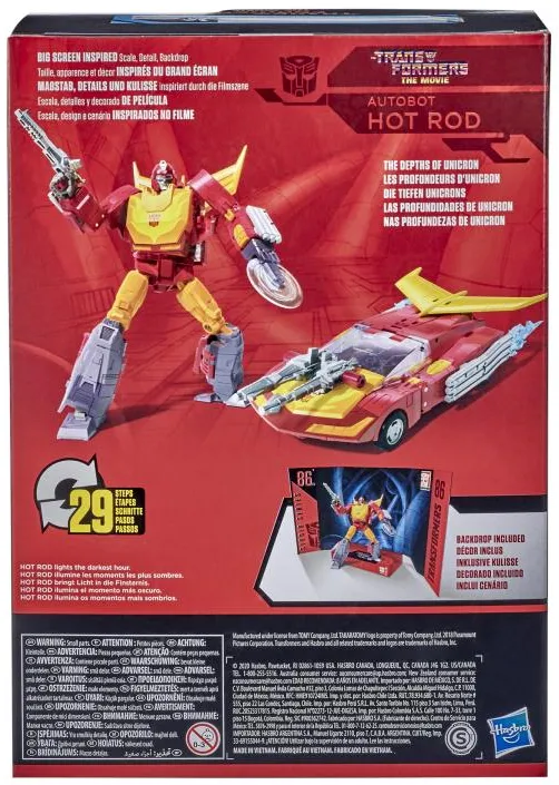 This Studio Series 86 Voyager Class The Transformers: The Movie-inspired Autobot Hot Rod figure converts from robot to sports car mode in 29 steps. Remove backdrop to showcase Hot Rod in the The Depths of Unicron scene. In the The Depths of Unicron scene from The Transformers: The Movie, Hot Rod embraces his destiny, becoming Rodimus Prime and defeating Unicron. Pose the figure out with the included Matrix of Leadership and attach the energy effect to recreate this classic movie moment.