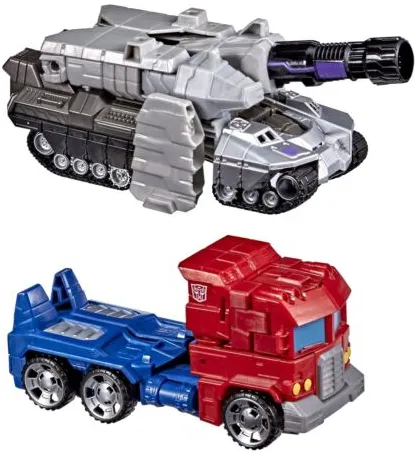 Experience the exciting world of Transformers with Heroes and Villains 2-Packs! Kids can imagine epic battles between the heroic Autobots and the evil Decepticons with classic Transformers characters! This 2-pack includes 7-inch figures depicting the Autobot leader, Optimus Prime, and the Decepticon leader, Megatron. Featuring simple conversion perfect for young Transformers fans, both figures convert between 2 modes. Convert the Optimus Prime toy from robot to truck mode in 7 steps and the Megatron toy from robot to tank mode in 8 steps. Look for other Transformers Heroes and Villains 2-Packs to imagine battles between the Autobots and Decepticons! (Each sold separately, subject to availability).