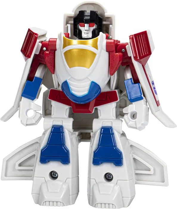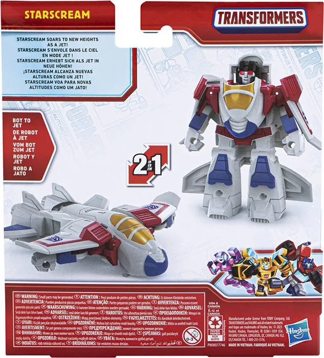 Imagine helping Starscream soar to new heights! As a mighty jet, Starscream is ready to take to the skies then swoop down and generally annoy everybody! Kids ages 3 and up can pretend there is a dangerous situation unfolding and convert the brave 4 1/2-inch Starscream action figure from a robot to a jet plane. Little heroes can imagine soaring to the scene for a treasonous mission to become the new leader of the Decepticons!