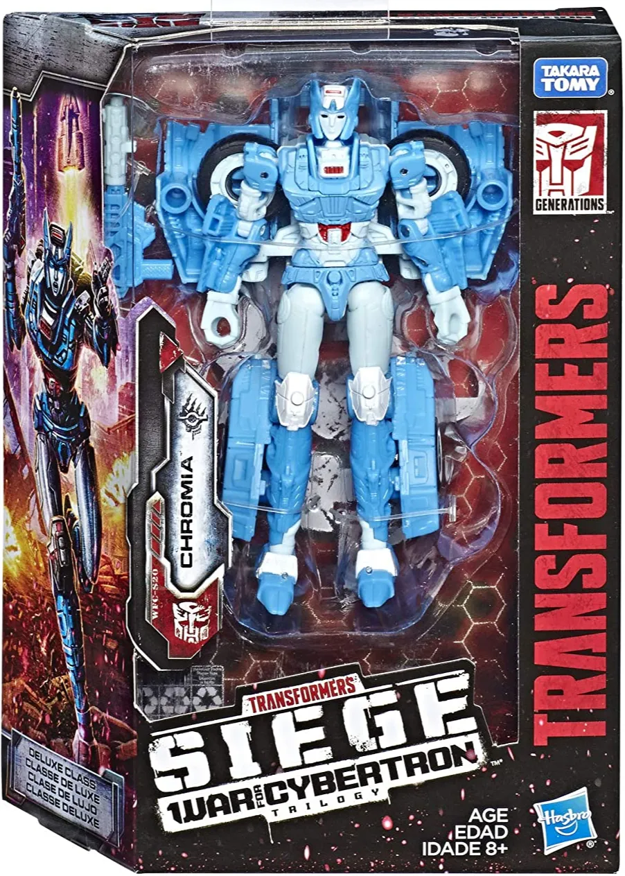 Transformers War for Cybertron Siege Chapter WFC-S20 Chromia is Deluxe Class Scale and stands approximately 5.0 inches tall in robot mode. WFC-S20 Chromia transforms from Vehicle to robot and back and is screen accurate to the Transformers: War For Cybertron Siege Chapter Netflix Animated Series. Each War For Cybertron figure jumps out of the big screen and into your collection with a high attention to detail and accurate color schemes reflecting their appearance in the Transformers animated series.