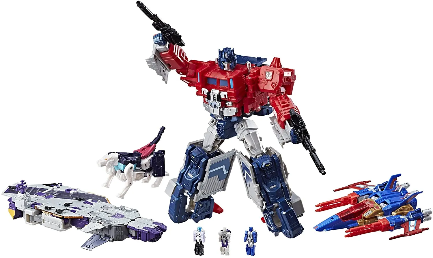 Transformers Siege on Cybertron boxed set brings together 5 legendary Autobot and Decepticon warriors into one boxed set! Included in this set is 1 Leader Class Magnus Prime Figure, 1 Voyager Class Tidalwave Figure, 1 Deluxe Class metalhawk Figure, 1 Legends Class Decepticon Pounce figure, 1 Titanmaster Thunderwing Figure. Together the decepticons lay siege to Cybertron and only the Autobots can stop them with the guidance of Magnus Prime!