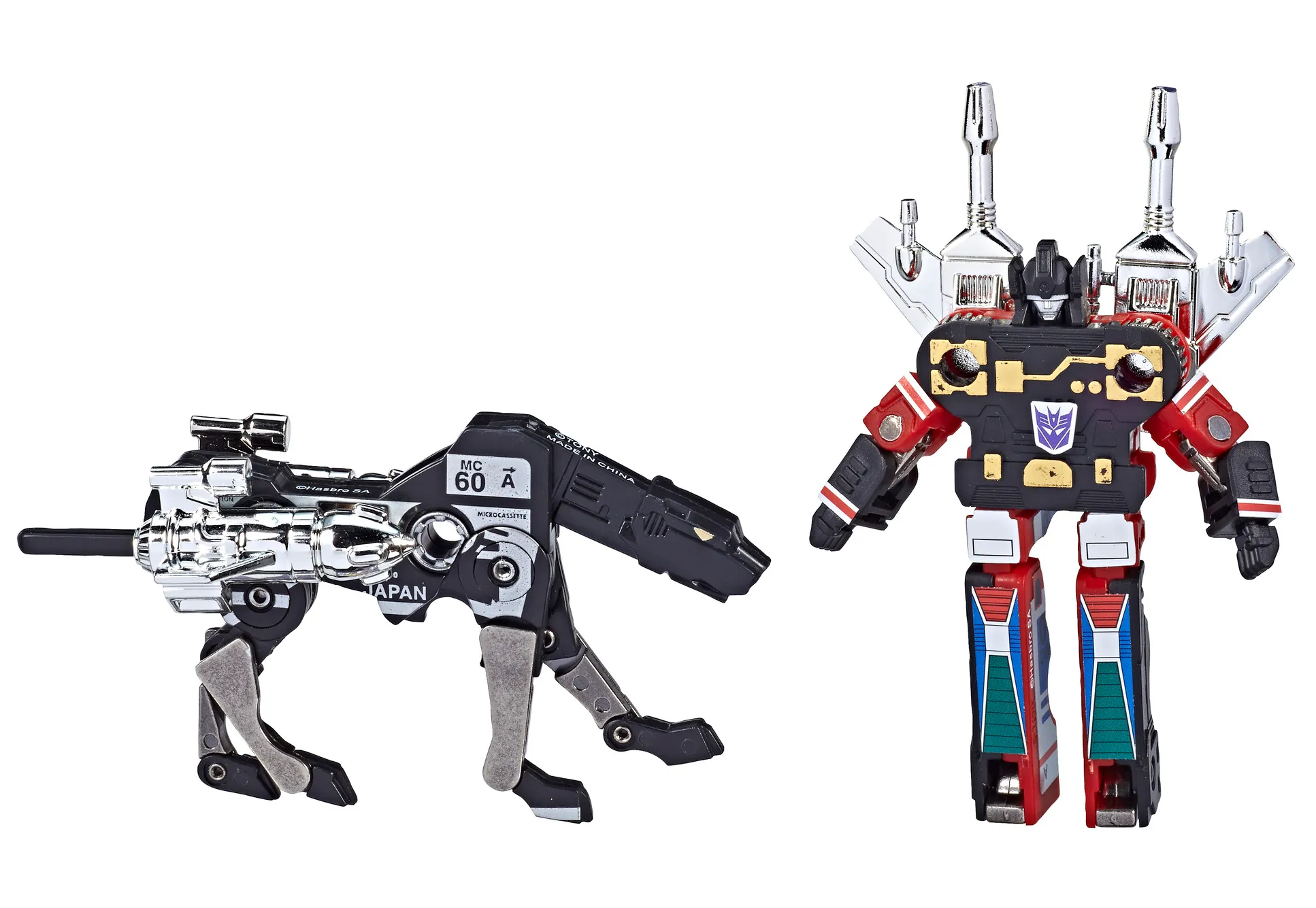 Experience the figures that started it all. These Transformers: Vintage G1 Cassette Decepticon Ravage and Decepticon Rumble figures are designed like the original G1 versions -- including figure styling, packaging, and art inspired by the 1984 G1 release, plus classic tech specs and accessories. (Re)start a vintage Transformers collection with these Decepticon Ravage and Decepticon Rumble figures.