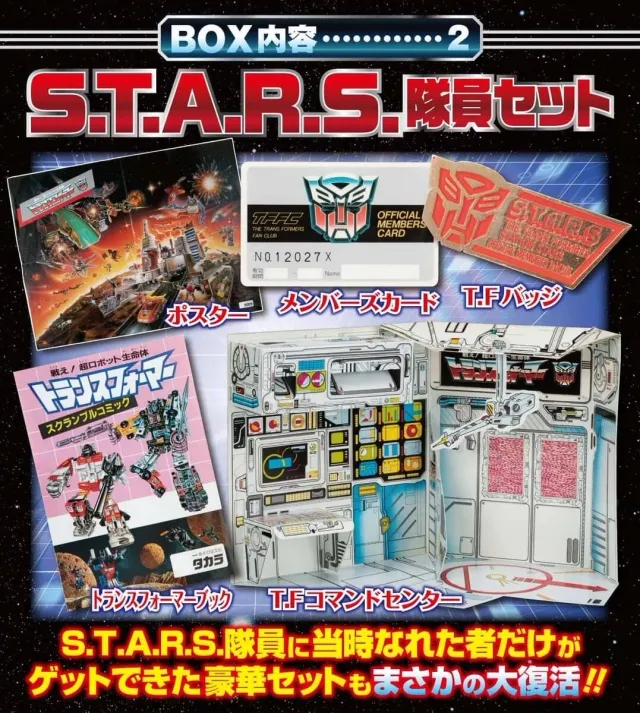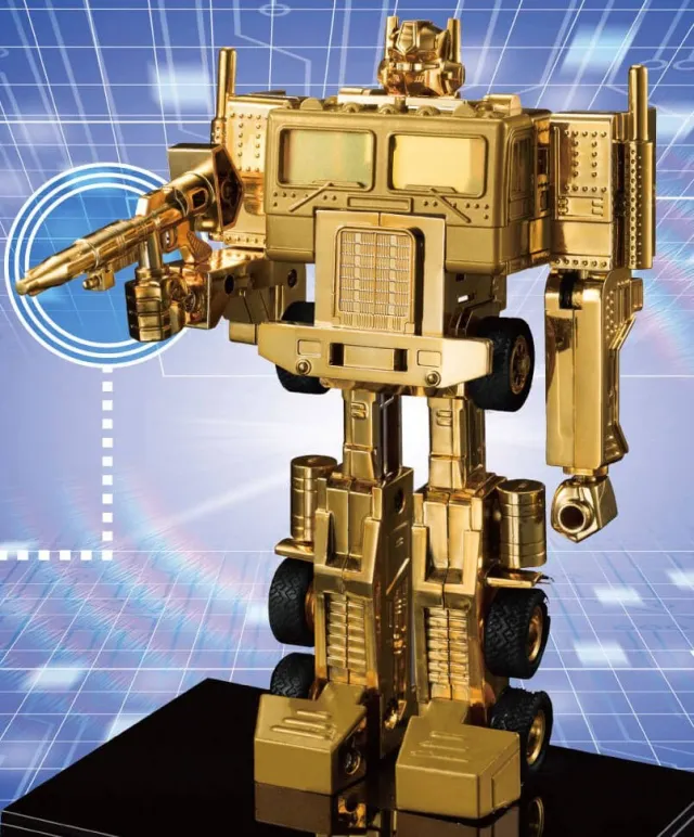 To celebrate the 35th Anniversary of the Transformers Takara Tomy announced a golden G1 Optimus Prime trophy! This generation 1 Optimus Prime toy in gold colors and over a pedestal. It can not be removed from the pedestal but it seems you still can transform it. Also included a reprint of the 1985 S.T.A.R.S kit which includes a cardboard Transformers command center, members card, a Transformers badge, a poster, a transformer book and more. Finally a transformers illustration book is included.