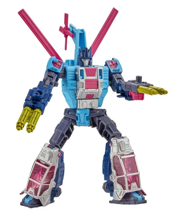 This Rotorstorm figure converts from robot to helicopter mode in 25 steps and comes with 2 blaster accessories that can attach to the figure's arms in robot mode and the undercarriage in helicopter mode.