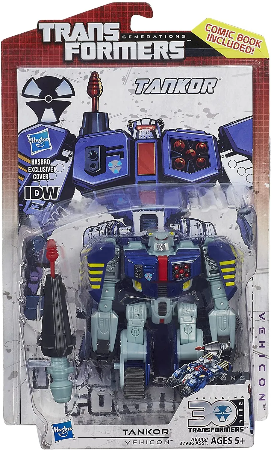 Tankor is a mountain of pure destructive force. Give him an objective and it's as good as done (and quite possibly crushed, smashed, or completely demolished). The Vehicon General doesn't have much for brainpower, but his skill in battle is nearly unrivaled. Convert, arm and attack with all the Transformers action you can handle! This Vehicon Tankor figure is fierce in robot mode, and he can fire a missile at his Autobot foes. But when he needs to just rumble over the foe, he can convert to Cybetronian tank mode with a missile launcher! Whatever mode your Vehicon Tankor figure is in, his enemies will think twice before taking him on!