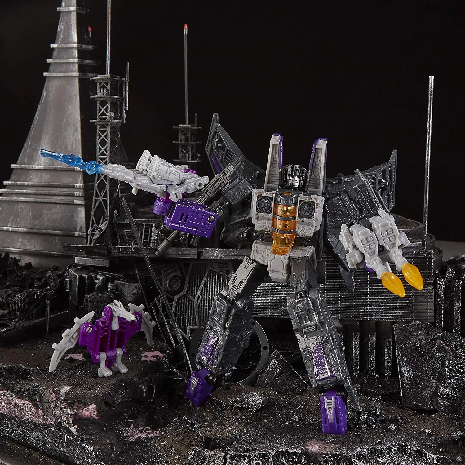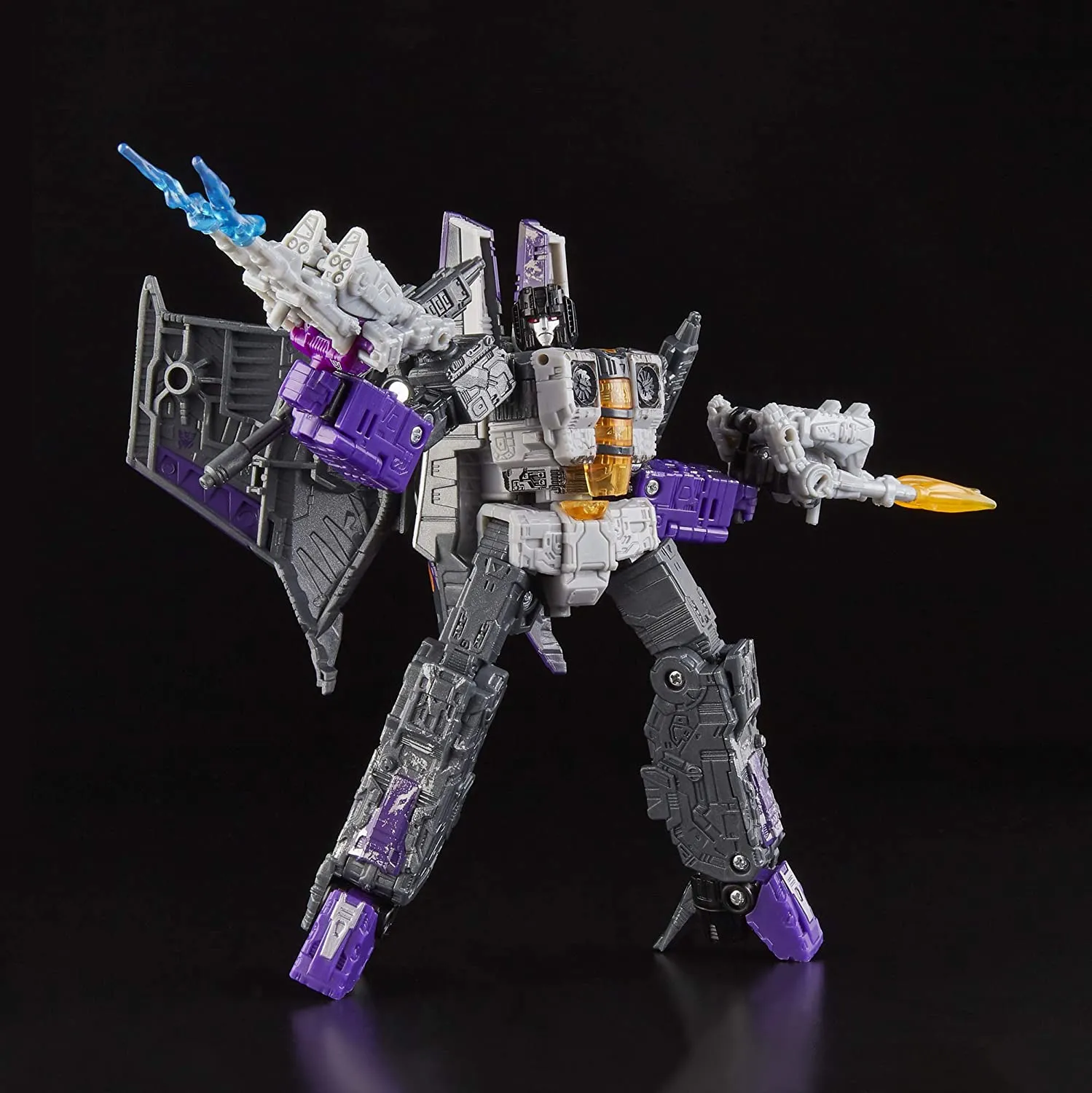 Transformers War for Cybertron Siege Chapter WFC-S27 Decepticon Phantomstrike Squadron 4 Pack - Final Strike Figure Series: Part 2 is Voyager Class Scale and stands approximately 6.5 inches tall in robot mode. WFC-S27 Decepticon Phantomstrike Squadron 4 Pack - Final Strike Figure Series: Part 2 transforms from Fighter Jet to robot and back and is screen accurate to the Transformers: War For Cybertron Siege Chapter Netflix Animated Series. Each War For Cybertron figure jumps out of the big screen and into your collection with a high attention to detail and accurate color schemes reflecting their appearance in the Transformers animated series.