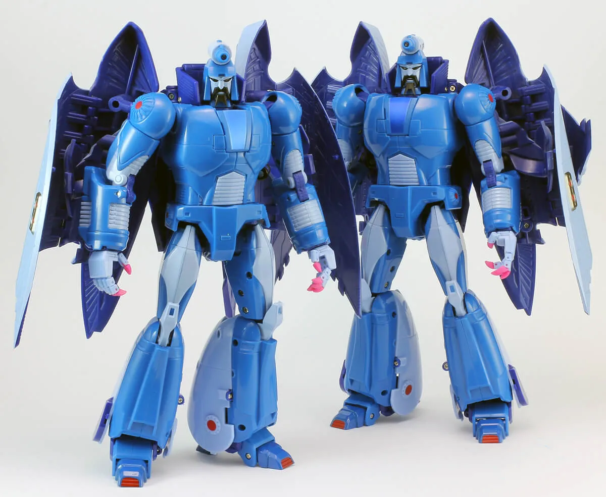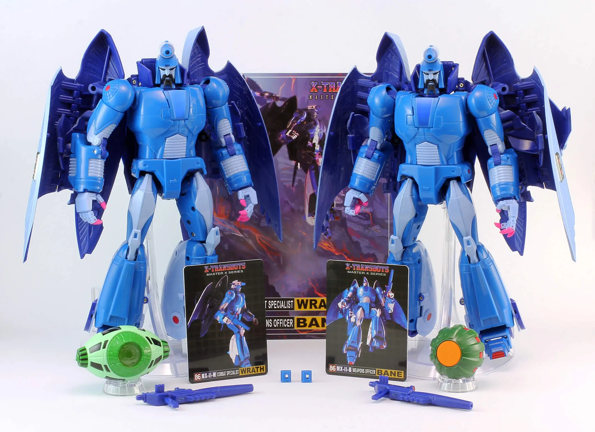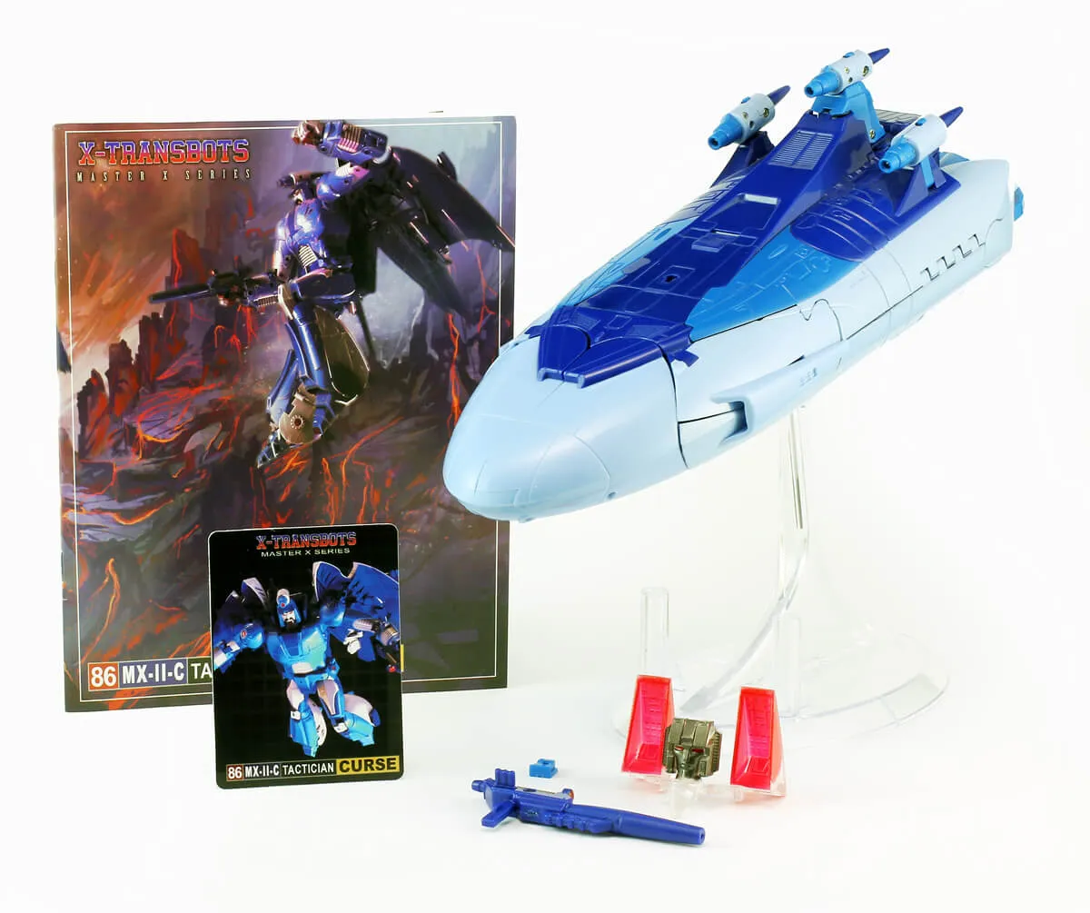 Each MX-II figure stands 9" tall in robot mode and transforms into a space vehicle. Curse comes with the Traitor's Ghost kit and the two-pack of Wrath & Bane includes the Cog of the City and the Eye of the City.