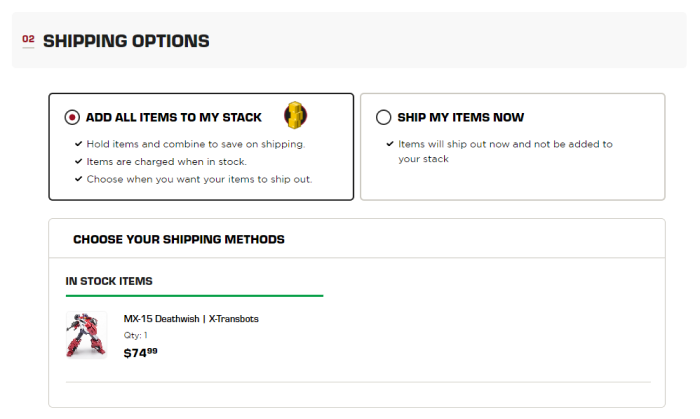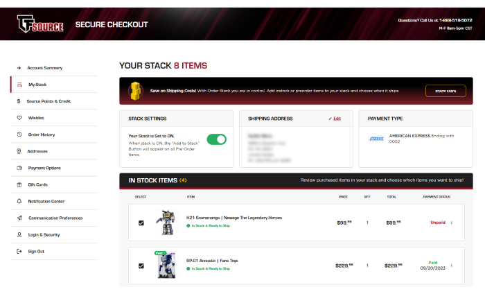 Log in to My Source and click on the Stack Manager tab. From here, you can have any of your in-stock items ship out at any time. With stack, if one item is delayed, you don’t have to keep waiting for your other items. Simply go into the TFS Ship Manager in My Source and select the items from your stack you want to ship out on a new order. Next, click Ship My Order, and an order is automatically created for you! Now, manufacturer’s delays won’t keep you from getting your much-wanted figures!